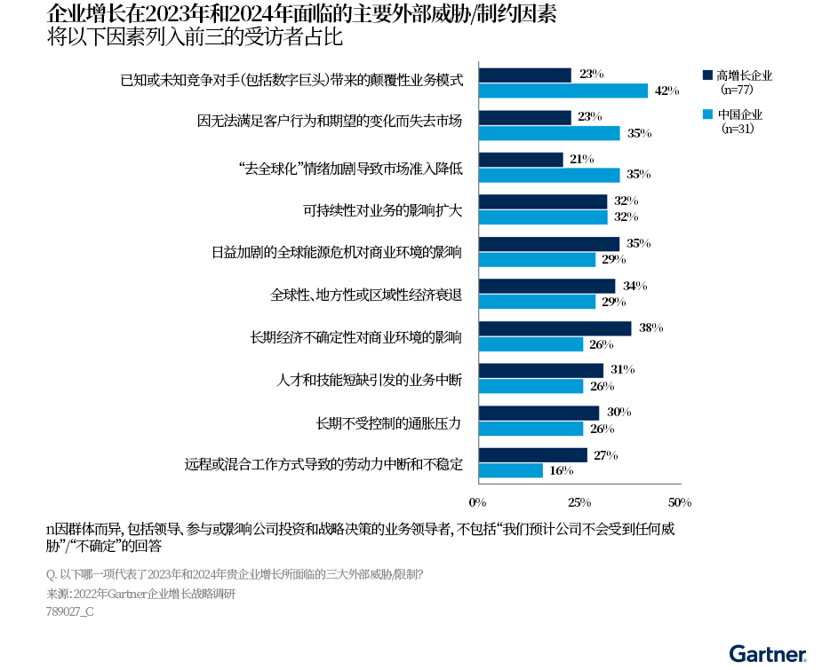 在寻找新增长机会的主要策略方面,中国企业与全球性高增长企业的最大区别在于对新业务构想和/或模式的尝试,前者占比为52%,后者占比为70%。中国企业与全球高增长企业之间的第二大差距是战略制定和业务规划,前者占比为58%,后者占比为70%。中国企业在分析客户行为和产品性能方面比全球高增长企业高出3%,因为客户行为的转变对中国企业来说是首要挑战。