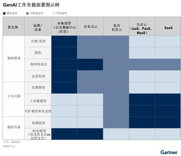 基于监管要求和对数据安全的担忧,对GenAI工作负载托管位置的决策变得更加复杂。由于监管义务或内部安全要求,某些企业必须将GenAI工作负载部署在本地。出于数据安全考虑,许多中国企业对使用公有云进行模型微调或通过MaaS部署GenAI应用持谨慎态度,更倾向于在私有环境中部署软件和模型。