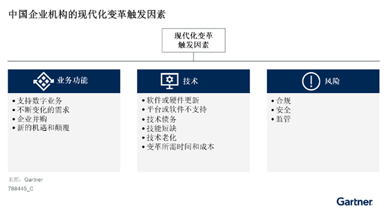 经历数十年的软件开发,现在中国市场上提供的应用数量已达到数千款,多数中国企业机构可从中选出满足自身需求的应用。但一些应用过于陈旧,已不提供软件支持服务,或者市场上缺乏相关的支持人才。此外,部分系统基于陈旧架构构建,难以快速满足客户需求。因此,许多应用和软件工程领导者选择对企业机构的应用进行现代化改造。但在此之前,他们必须区分促成业务功能、技术和风险这三个领域现代化变革的不同触发因素,如图1所示。