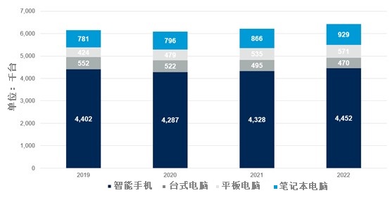 2022年全球设备装机量将达到64亿台,比2021年增长3.2%(见图一)。虽然向远程办公模式的转变加剧了台式电脑的衰退,但却促进了平板电脑和笔记本电脑的使用。2021年笔记本电脑和平板电脑的使用量将分别增长8.8%和11.7%,而台式电脑的使用量预计将从2020年的5.22亿台下降到2022年的4.7亿台。