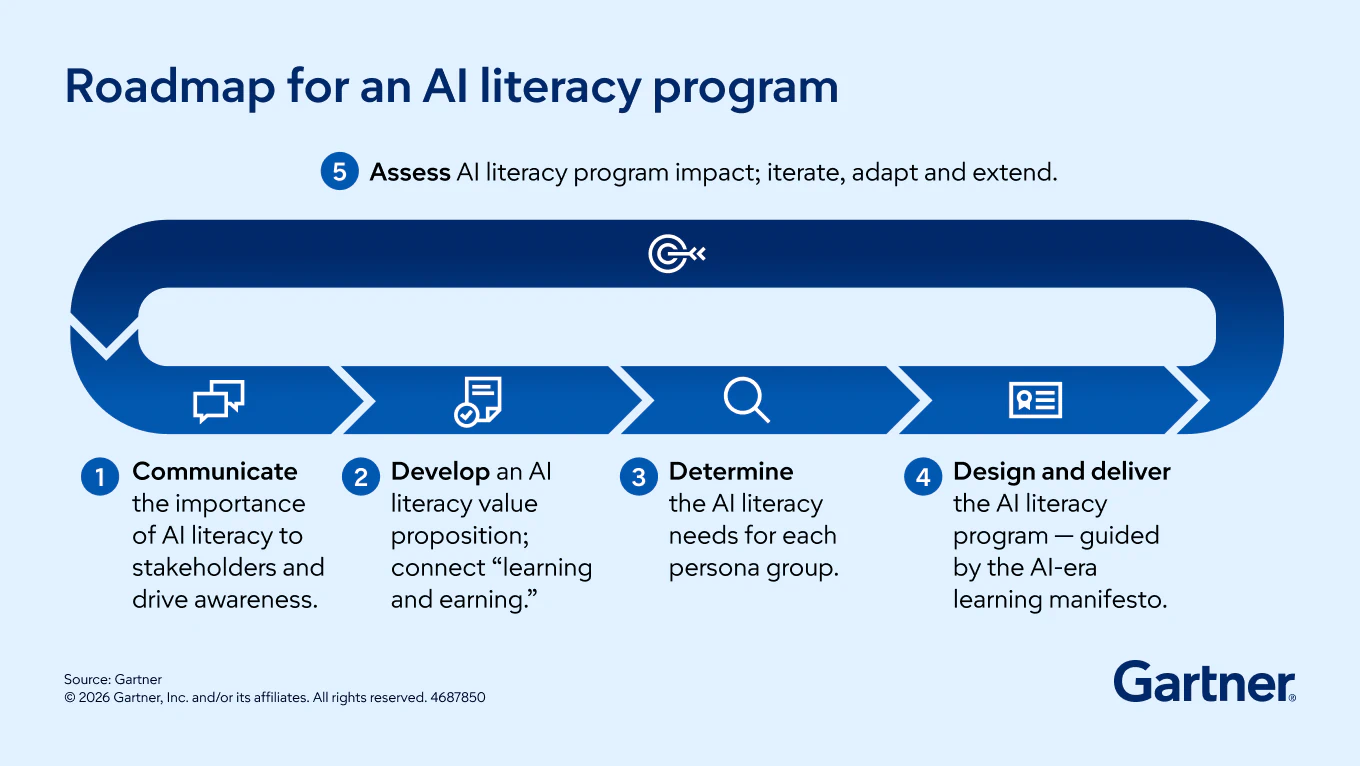 Measure business outcomes, not just completion rates. Gartner recommends linking learning activities to high-value use cases and strategic goals. Regularly assess skill gaps, stakeholder priorities and program effectiveness. Adapt your approach as business needs and technology evolve.