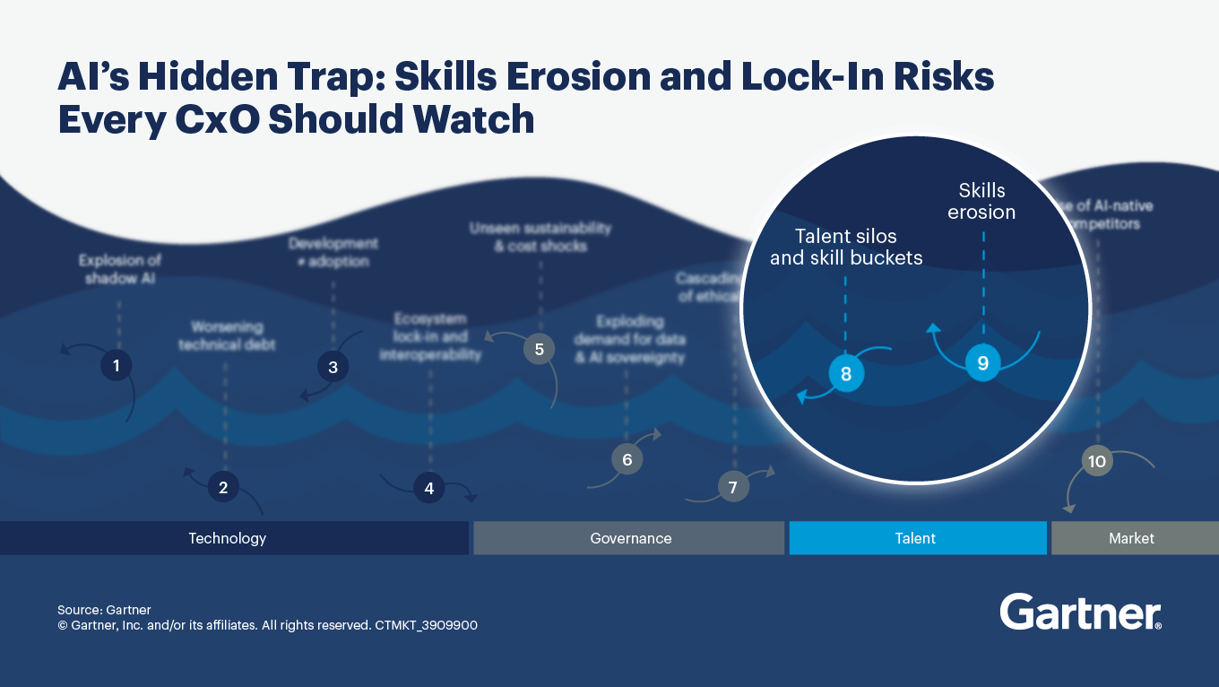 AI agents are already making business decisions, and Gartner projects by 2028, they will handle a full third of them. Without strong human oversight, organizations will struggle to spot and correct AI’s mistakes. This exposes the business to operational errors and reputational damage. Over time, unchecked skill erosion creates a vicious cycle: fewer skilled workers, greater dependence on AI and higher costs to fill critical gaps.