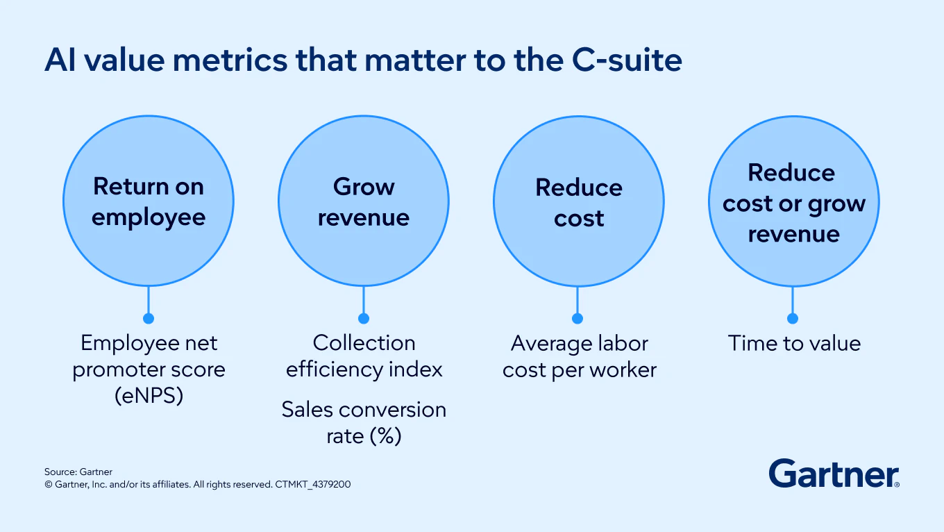 Gartner insights identify 10 metrics that best demonstrate AI’s tangible impact with multiple C-suite stakeholders and can be implemented quickly. To see the full list, fill out the form on this page to explore becoming a Gartner client.