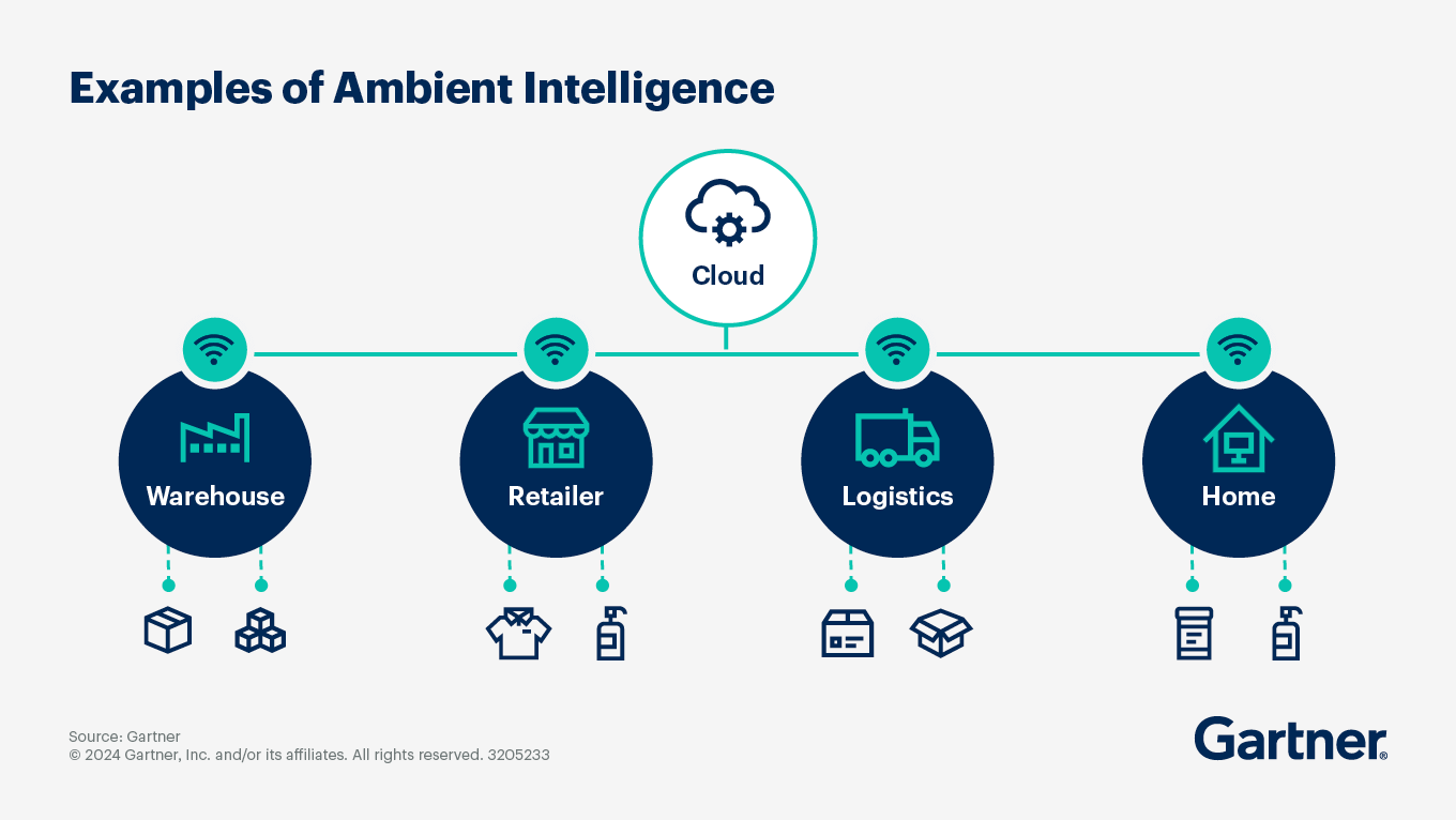 Through 2028, early examples of ambient intelligence will focus on reducing costs and improving efficiencies via low-cost item tracking and sensing. The infrastructure requirements will limit use to single organizations or tightly coupled supply chains. The opportunities include: