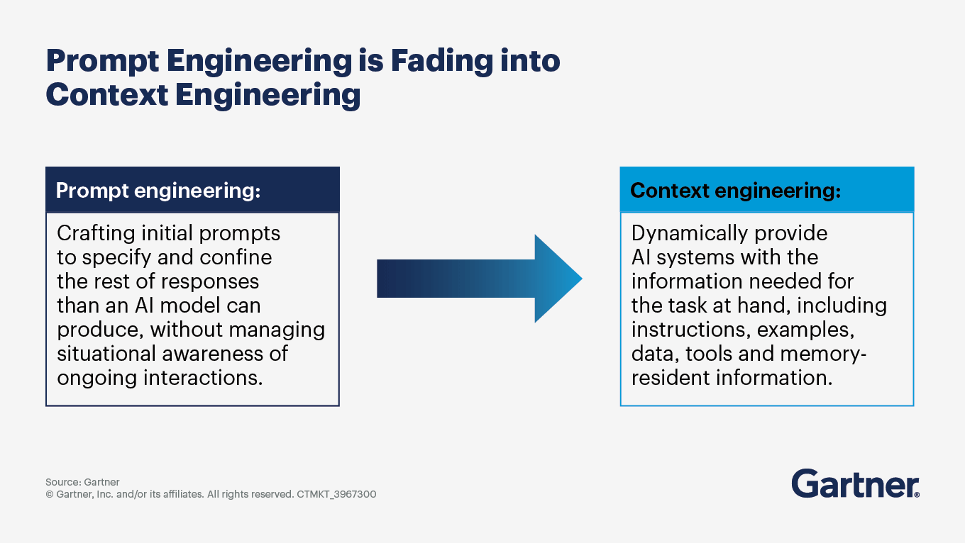 Gartner defines context engineering as designing and structuring the relevant data, workflows and environment so AI systems can understand intent, make better decisions and deliver contextual, enterprise-aligned outcomes — without relying on manual prompts.