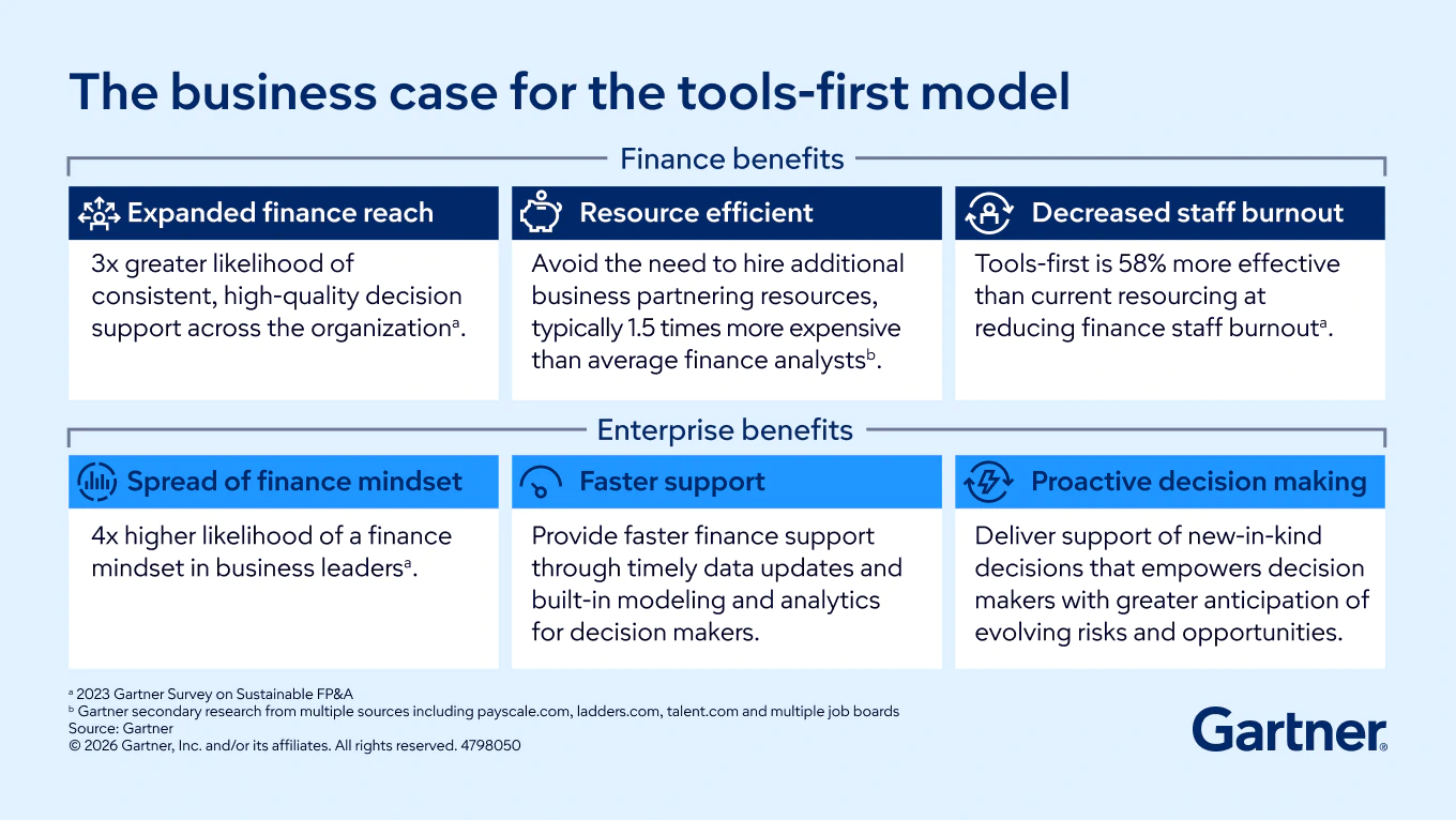 The tools-first model enables decision makers to access finance’s insights themselves. This self-sufficiency enables finance to scale its insights to more decision makers without burning out its staff. Gartner insights show that finance teams that adopt a tools-first model are 3x to 4x more effective in delivering consistent, high-quality guidance, and 58% more effective at reducing finance staff burnout.