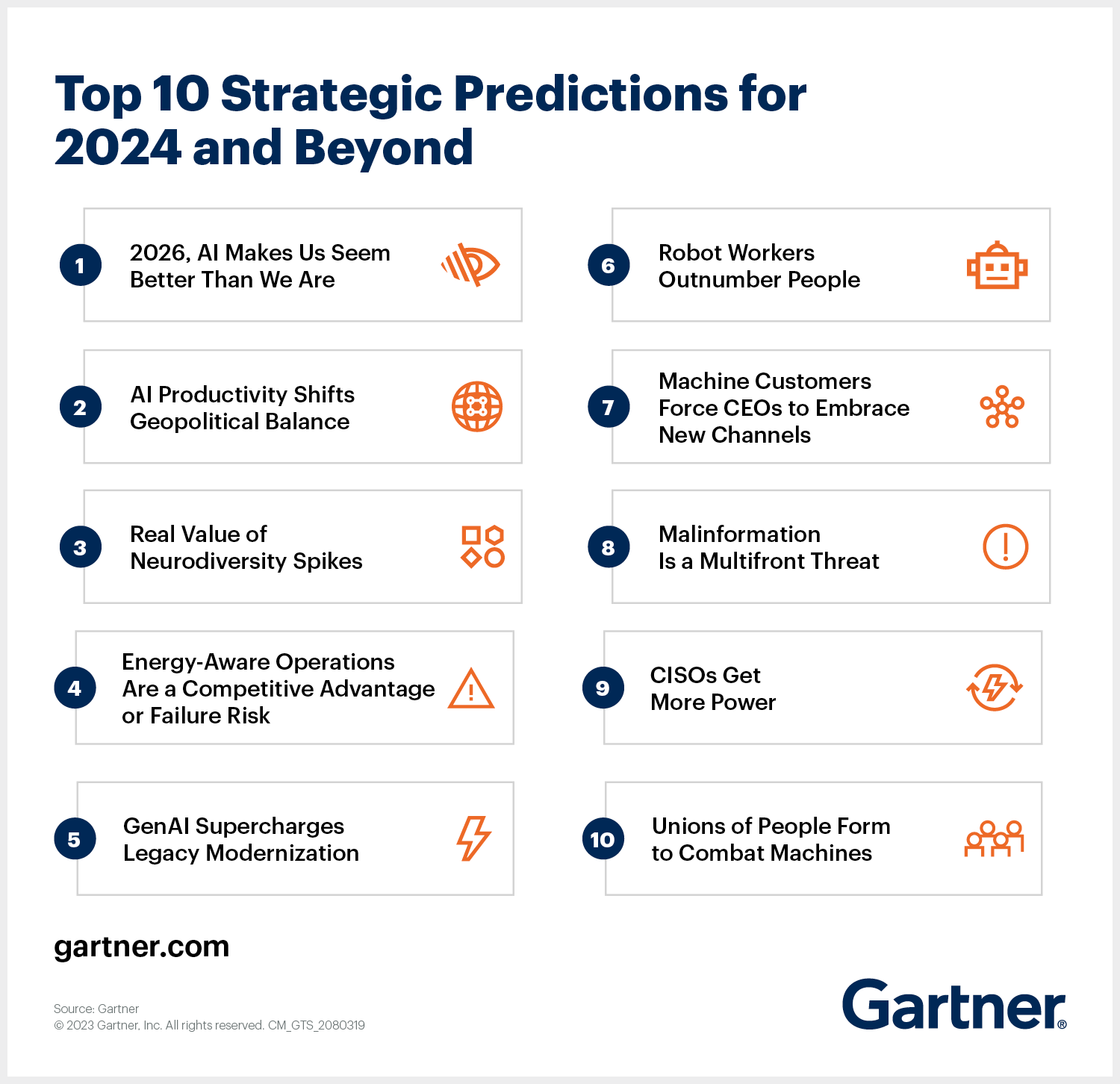 Gartner’s 2024 predictions, which we expect your organization will come up against in the next three to five years, fall into three categories, and encompass the most critical areas of technology and business evolution.