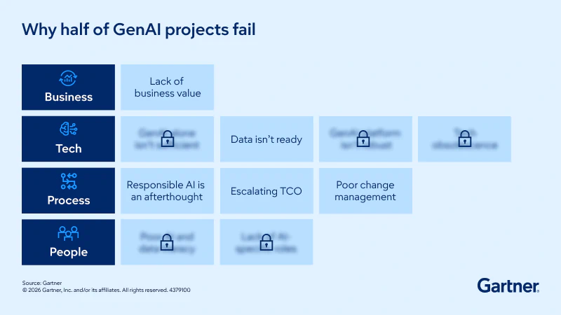 Poor use-case selection combined with lack of business value consistently tops the list. Organizations that don’t establish specific success metrics and align GenAI with strategic objectives face the highest failure rates. That’s why Gartner recommends treating GenAI as a business transformation initiative, not just a technology deployment.