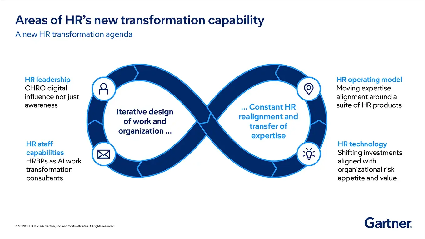 HR’s mandate is expanding. It’s no longer about enabling the workforce but about enabling how work gets done. HR transformation must build permanent adaptability that allows HR to consistently reinvent itself while guiding the evolution of work. Think: an AI‑integrated HR strategy tied directly to enterprise priorities, an AI-infused HR operating model that elevates human judgment where it matters and lets AI accelerate the rest, a focused portfolio of high‑value use cases and technologies, and governance that is both simple and strong enough to protect trust.