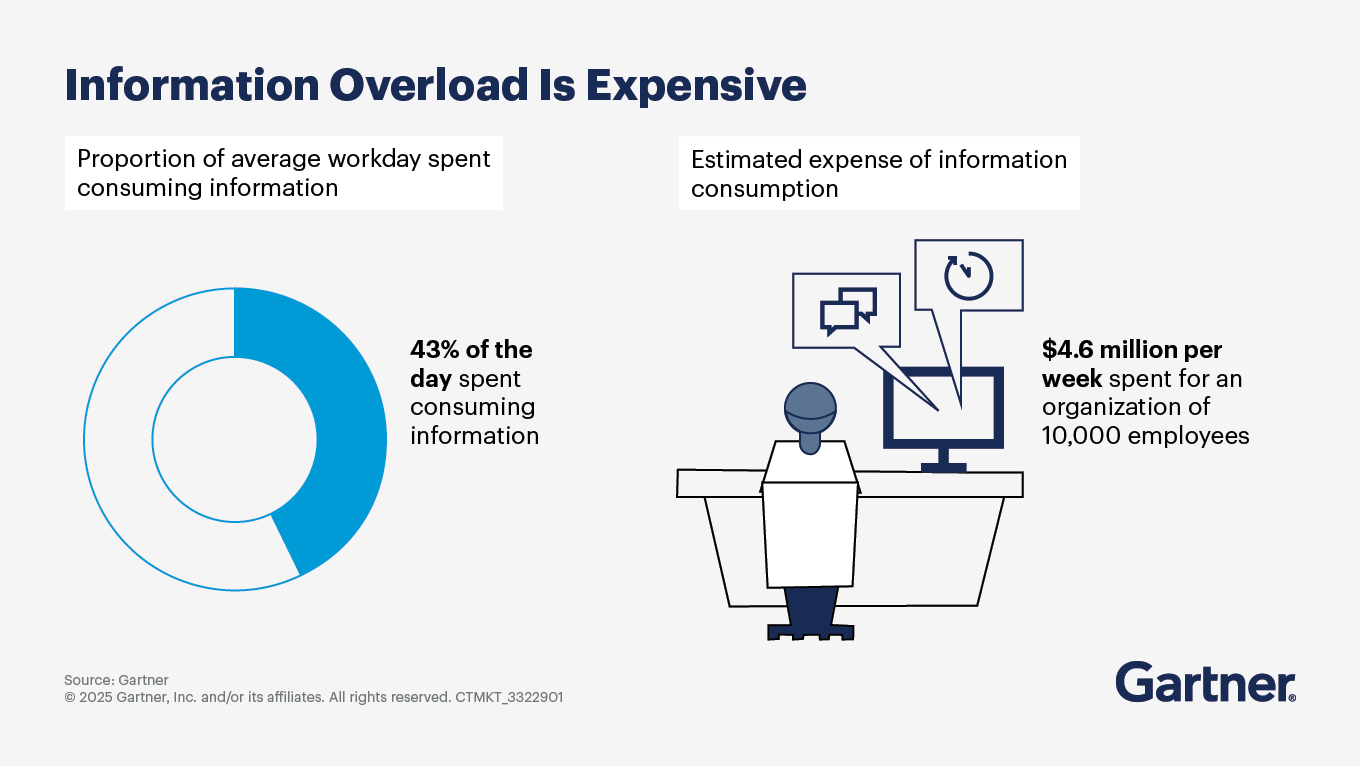 As you read this article, internal messages are traveling across your organization at breakneck speed on company apps, email and chat, impacting productivity, employee retention and strategic alignment. More than a quarter of employees and 38% of managers report feeling overwhelmed by excessive communication. This overload is linked to lower alignment with corporate strategy and a reduced intent to stay, as well as millions of dollars in lost productivity as employees spend valuable hours sifting through redundant or irrelevant messages.