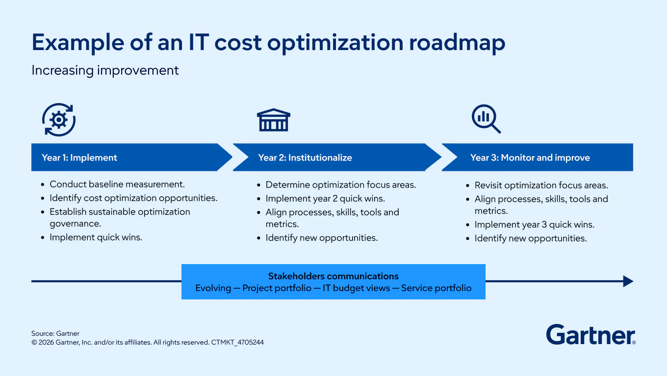 Publish a one‑page, three‑year IT cost optimization roadmap to align executives and drive prioritization. State that timing may be adjusted as needs evolve.