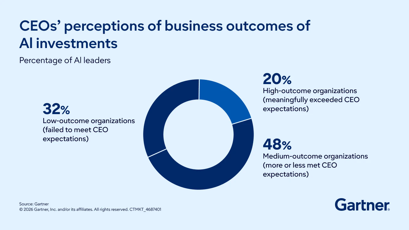 According to Gartner, only 20% of organizations surpass their CEOs’ expectations for AI outcomes. CIOs in this group excel by embedding AI strategy across the enterprise, structuring dedicated teams, fostering business trust, and implementing robust metrics and portfolio management to track and maximize value.