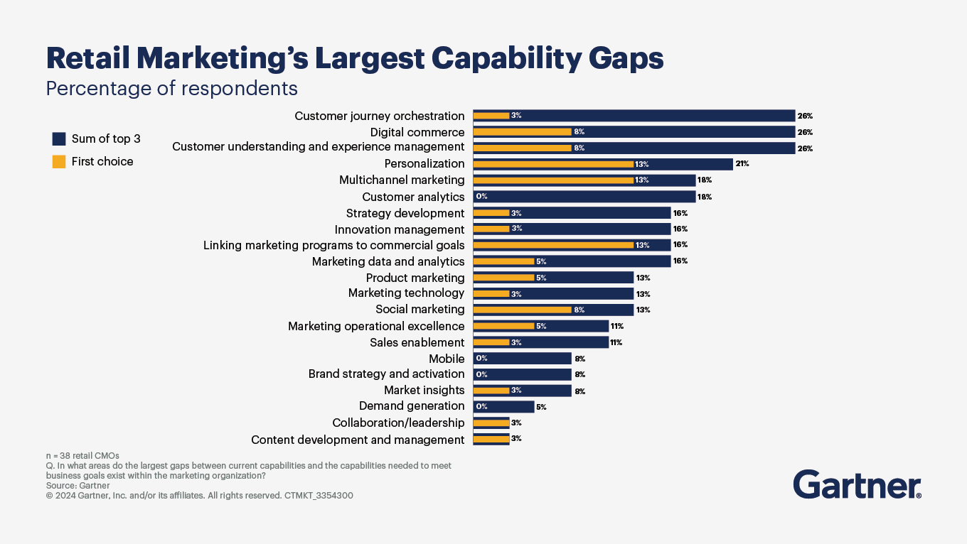 Retail chief marketing officers (CMOs) want their teams to be strategic partners and thought leaders that support business growth. However, capability gaps, most notably in customer understanding and experience management, digital commerce and customer journey orchestration, can limit their ability to deliver on this goal.