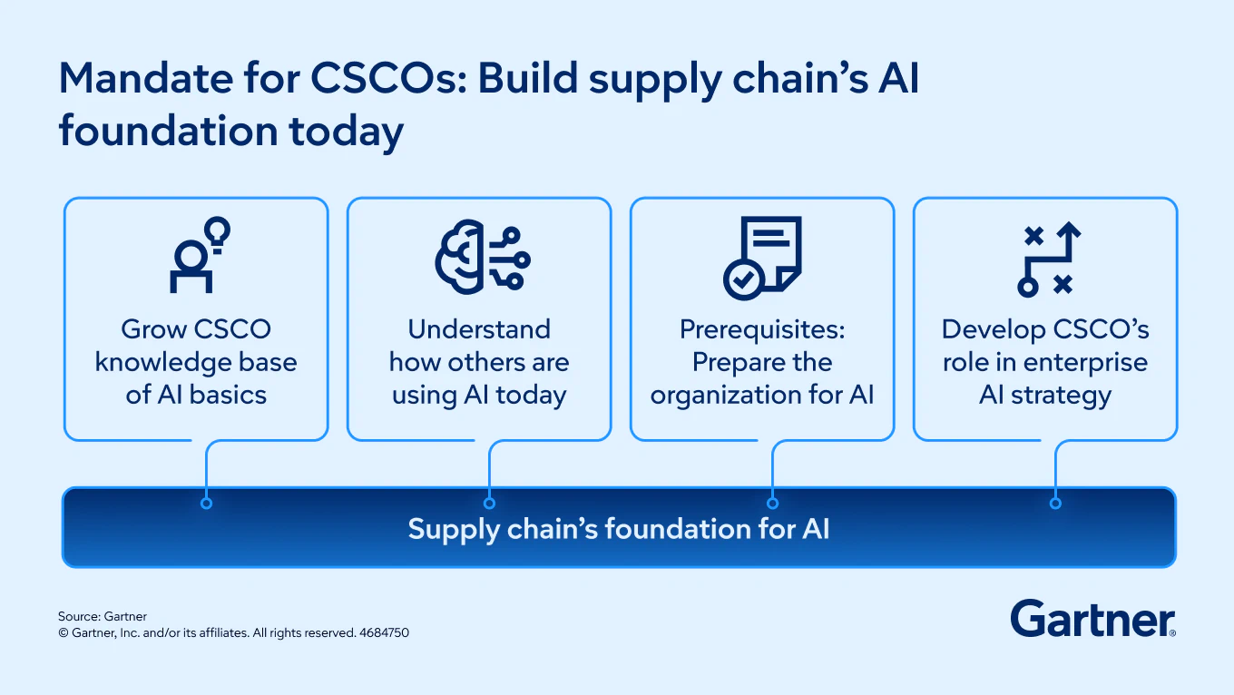The Gartner perspective? To establish a supply chain AI foundation, CSCOs should focus on four priorities: Expand their AI expertise, learn from industry leaders, assess organizational AI readiness and advance their role in enterprise AI strategy.