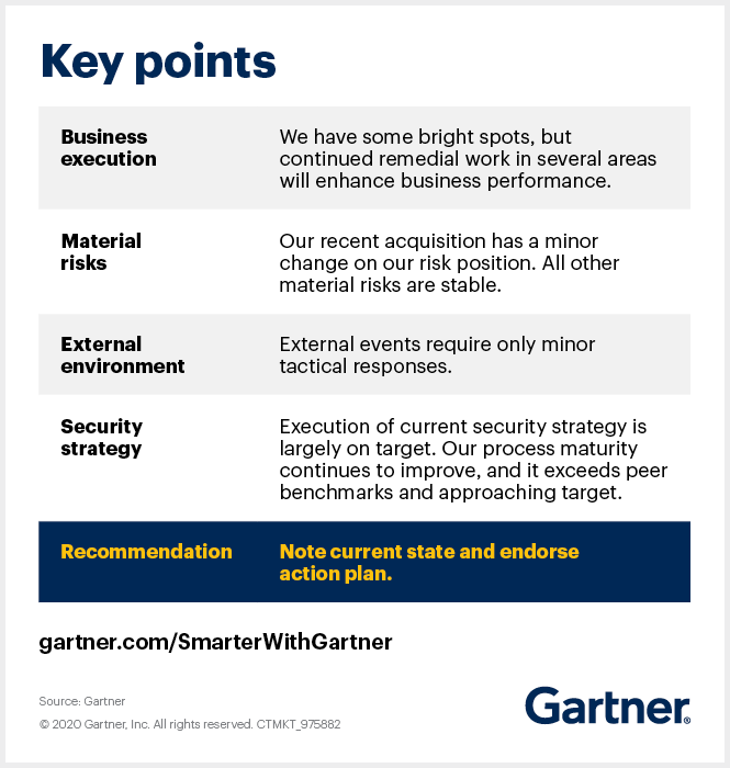 Slides 3 through 6 should discuss how external events will affect security, an assessment of the existing risk position (this can change depending on acquisitions and other events) and the entire security strategy.