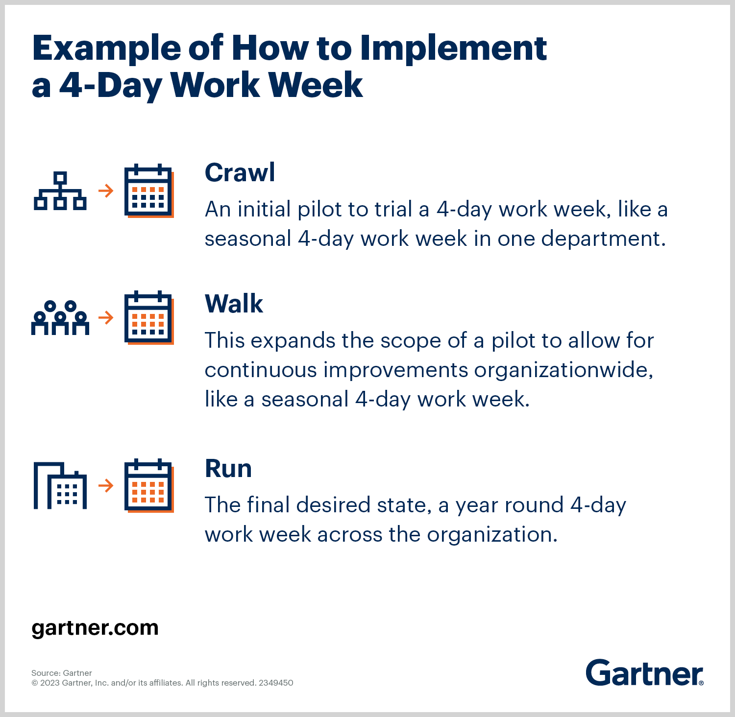 The “crawl” stage is an initial pilot to trial a 4-day work week, like a seasonal 4-day work week in one department.