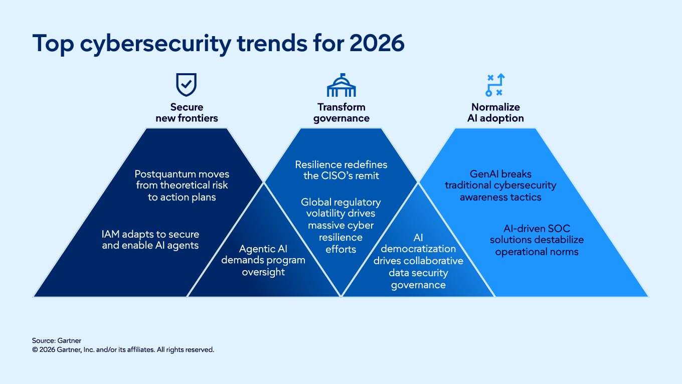 CISOs enter 2026 facing intensified pressure from geopolitical uncertainty, regulatory fragmentation and rapid AI expansion — all of which are reshaping enterprise risk and elevating expectations for more adaptive cybersecurity strategies. Gartner’s top cybersecurity trends reflect this shift, outlining where leaders must focus to secure emerging technologies, modernize governance and normalize AI adoption to build resilient, future‑ready programs.
