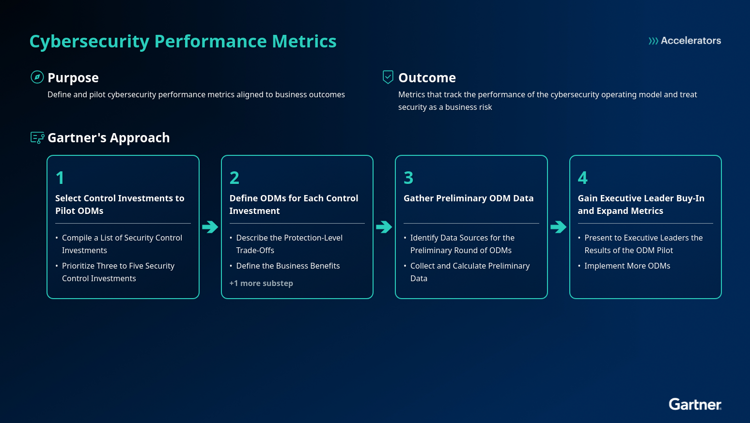 Pilot cybersecurity metrics aligned with business outcomes to treat security as a business risk. This Accelerator aids in tracking performance, addressing risks and aligning with organizational goals.