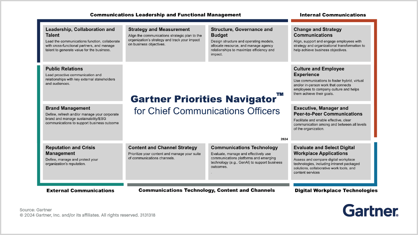 Gartner for Communications Leaders provides insight, guidance and tools to help the CCO thrive as an executive leader, transform communications strategies, support timely organizational needs and elevate the employee experience, all while strengthening the brand’s reputation both externally and internally.
