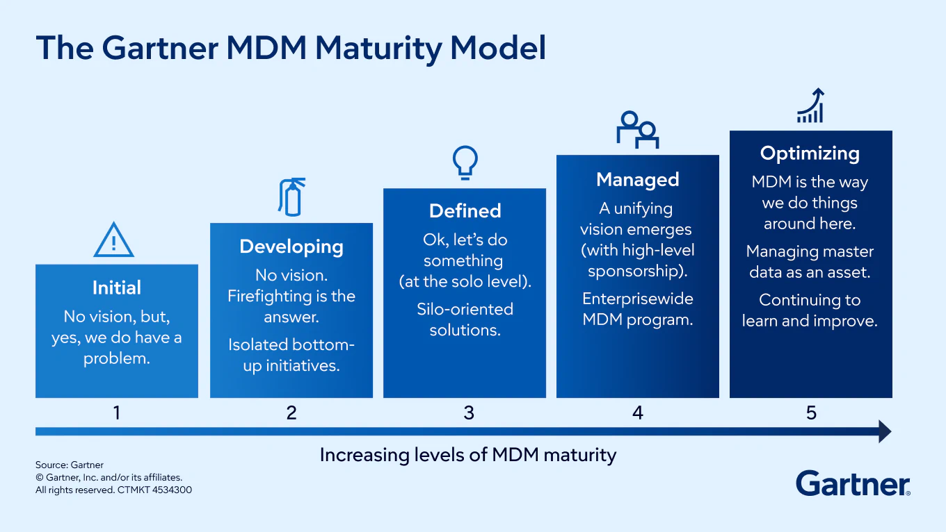D&A leaders use the Gartner MDM Maturity Model to manage the health, strength and direction of their MDM program. The model breaks master data management maturity into five levels: initial, developing, defined, managed and optimizing. The exercise of assessing MDM maturity can motivate stakeholders to discuss what’s missing and brainstorm about the ideal future state.