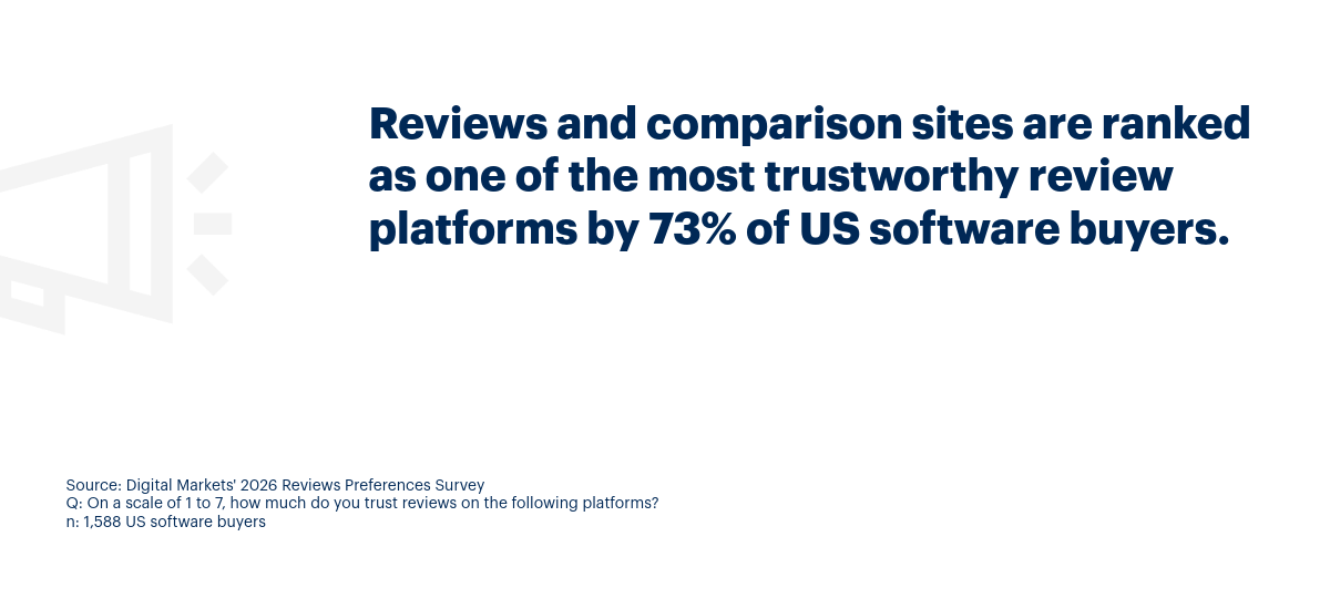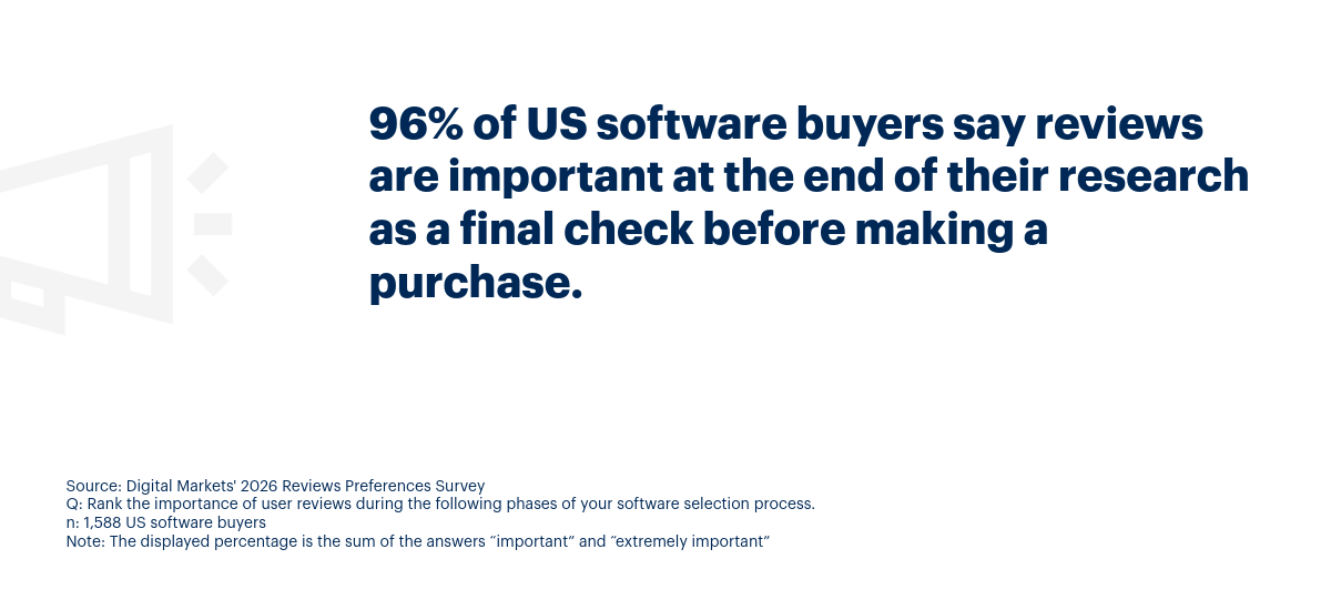 Digital Markets' 2026 Reviews Preferences Survey was conducted in December 2025 among 1,588 respondents in the U.S. The goal of the study was to understand buyer preferences regarding their use of online reviews to research business software, as well as the sources they find trustworthy and the aspects they find important. Respondents were screened for full-time employment at companies with more than one employee, who are at least partially responsible for software purchase decisions in their company. Respondents were also confirmed to consult user reviews for most of their purchases.