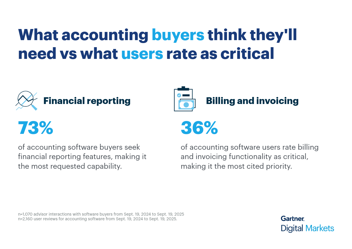- Showcase financial reporting and billing as dual priorities: Buyers request financial reporting (73%) most during purchase, while users value billing and invoicing (31%) for daily operations. Highlight how your software supports both strategic oversight and operational efficiency. Use real-world examples to show how businesses manage cash flow and generate accurate reports.