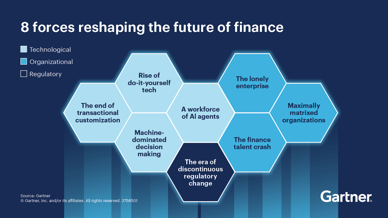 Technology—especially agentic AI—will drive efficiency and require a reassessment of finance’s role. Organizational complexity and new behaviors will reshape talent and team structures. Discontinuous regulatory change will challenge core activities like scenario planning, business partnering, and compliance.