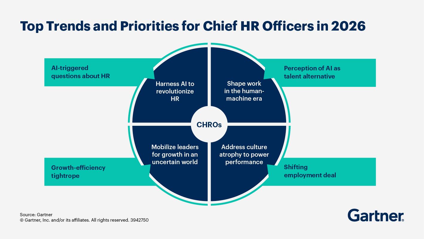 Gartner surveyed hundreds of CHROs across all major industries to uncover the latest HR trends, priorities and expected challenges for 2026. Download the Gartner 2026 Top Priorities for CHROs to explore the four initiatives CHROs are prioritizing in 2026, understand the forces driving these shifts and get actionable steps to drive business impact.