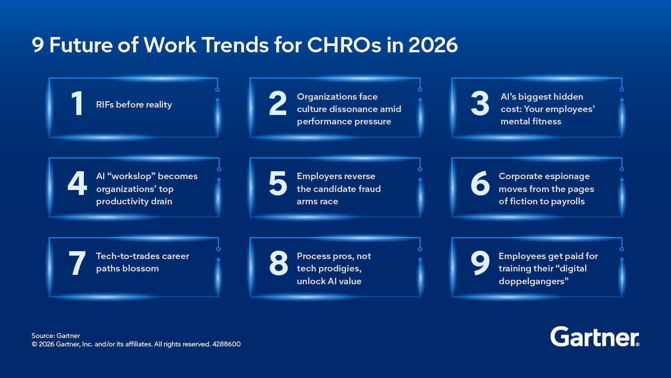 Organizations are entering 2026 amid relentless change. CEOs are setting bold growth targets fueled by AI hype, yet only one in 50 AI initiatives delivers transformative value. This tension between promise and reality puts CHROs at the center of a workforce in flux. The Gartner nine future of work trends reveal how technology, talent and trust will shape success — and what leaders must do now to build resilience.