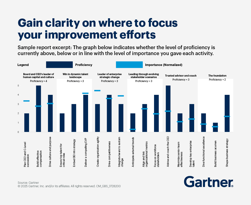 After completing the assessment, you will receive a detailed feedback report. This report highlights your strengths and areas for development, providing a clear picture of your current proficiency levels. The report also includes actionable recommendations from Gartner HR experts, helping you prioritize your development efforts.