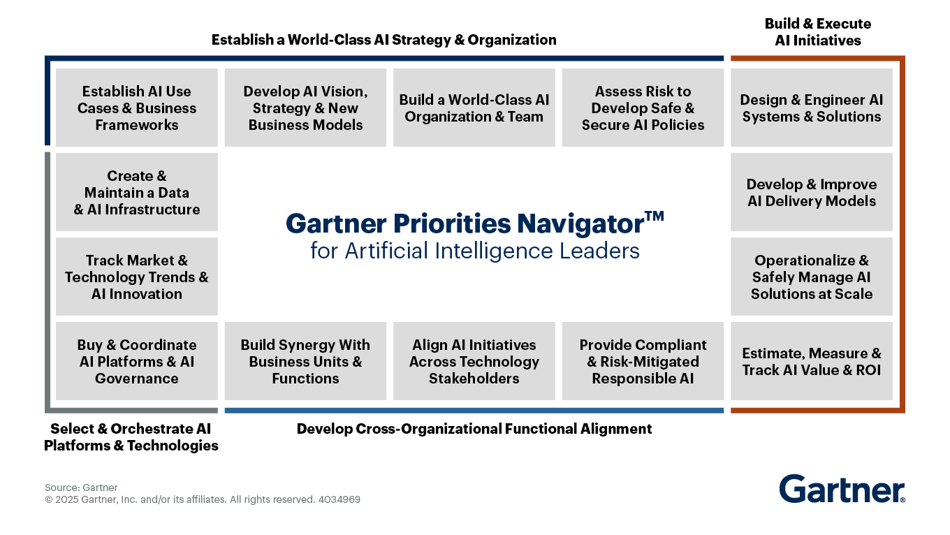 The Gartner Priorities Navigator™ framework represents mission-critical areas where Gartner provides supportive expert advice and tools to AI leaders and their teams.