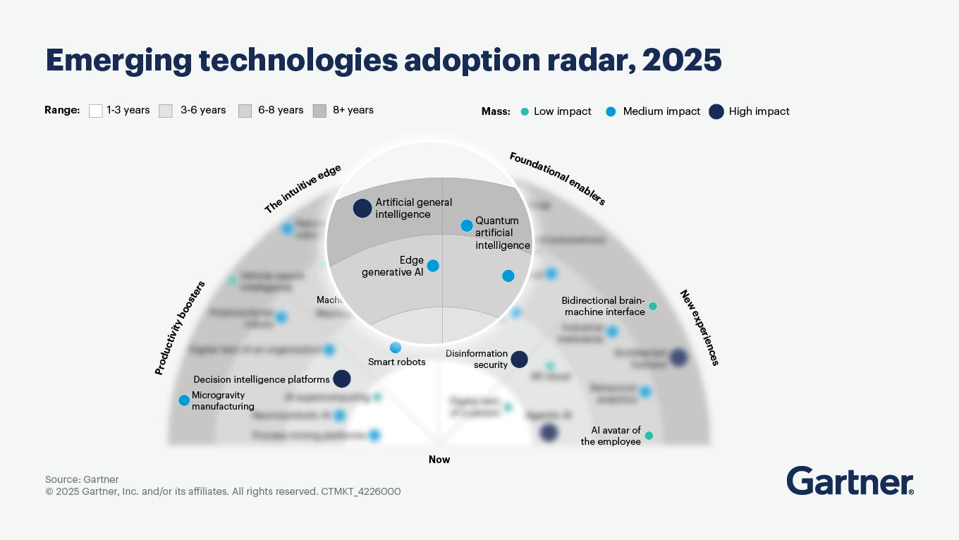 Gartner predicts that AGI (artificial general intelligence) will not materialize for at least a decade, likely requiring several breakthroughs beyond scaling current technologies. By 2035, there will be progress toward AGI, but it will not be widely recognized as achieved.