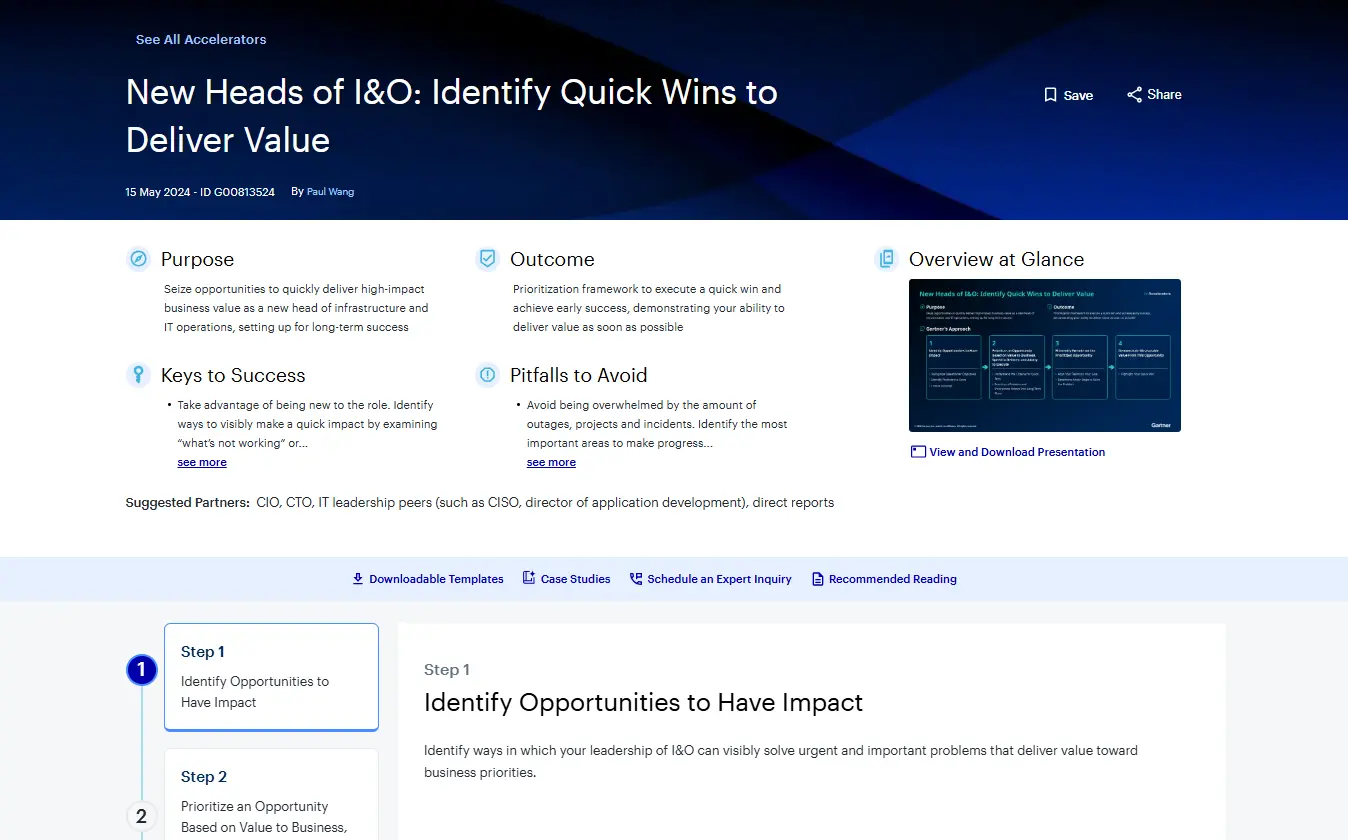 Seize opportunities to quickly deliver high-impact business value as a new head of infrastructure and IT operations, setting up for long-term success. This Accelerator helps you build a prioritization framework to execute a quick win and achieve early success.