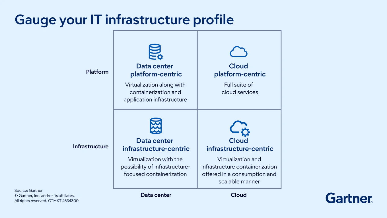 Data-center-platform-centric. This environment reflects a need to expand beyond base infrastructure to include platform services. It also involves managing critical workloads and intense staffing demands ─ including skills in cloud-native infrastructure and hybrid operations. Tight tethering and collaboration with application developers and software engineers are required, as infrastructure is key to enabling efforts.
