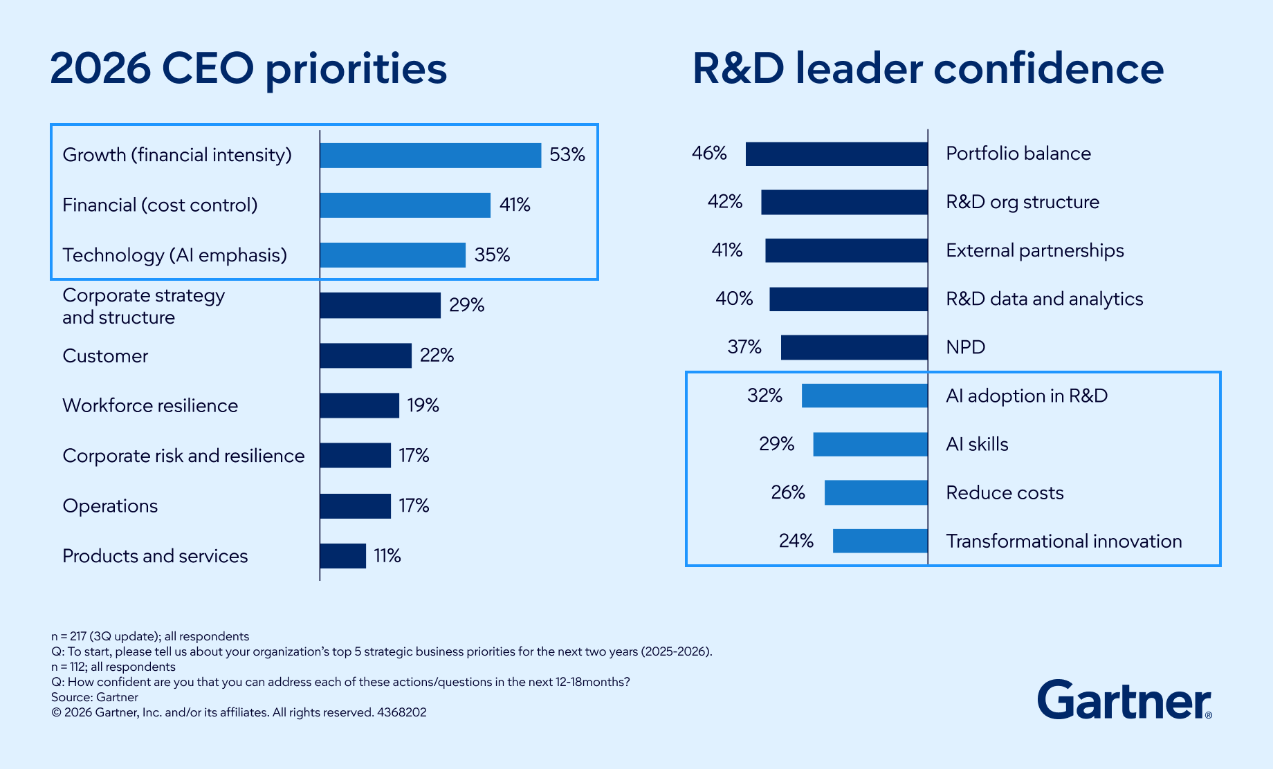 The top priority for CEOs in 2026 is growth, yet R&D leaders face significant internal friction in delivering it. Approximately 69% of R&D leaders feel pressured to prioritize short-term over long-term innovation investments. This creates portfolio gridlock, where only 3% of resources are being reallocated to more promising transformational projects. Furthermore, R&D leaders struggle to maintain influence at the executive table. Consequently, R&D portfolios often lag in health, failing to align sufficient high-value projects with the organization’s broader strategy.