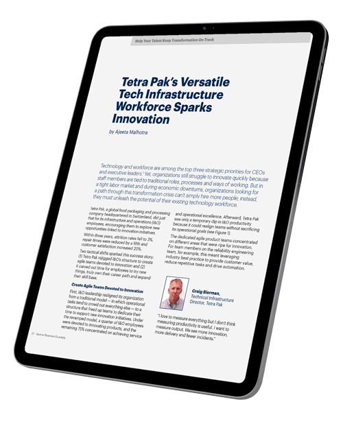 Discover how a global food packaging and processing company encouraged its infrastructure and operations (I&O) leadership to explore new opportunities linked to innovation initiatives and in doing so helped attrition rates fall by 3%, repair times reduce by a fifth, and customer satisfaction increase by 20%.