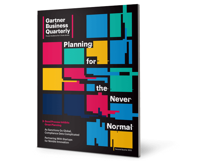 This issue of Gartner Business Quarterly is for the executive who sighed, during a conversation, about “the five minutes between omicron and the invasion” and for the corporate leader who told us his company isn’t preparing for “the new normal” or even “the next normal” — in his words: “it’s going to be the ‘never normal.’” Our core collection of short articles is for every organization where the crisis management committee seems to sit on permanent high alert. The successive catastrophes of the past two years transcended any one region — more than 6 million killed by COVID-19, more than 5 million refugees fleeing Russia’s invasion of Ukraine, untold levels of exhaustion and stress.1 Meanwhile, climate change is here.2 These thunderbolts hit far more than business, of course. Still, they raise a host of basic questions for large and mid-size enterprises, private and public alike. How will organizations protect employees, customers or suppliers (can they prioritize all three)? Where in the world will they operate and sell their services and goods? Can they still propel prosperity and growth?