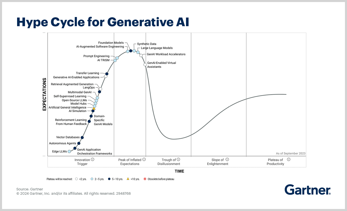 Since the late-2022 launch of ChatGPT, a chatbot capable of very human-seeming interactions, GenAI investment has ballooned. The market for GenAI-enabled virtual assistants and bots now includes many players. However, many GenAI technologies had already found their way to the Peak of Inflated Expectations on the 2023 Gartner Hype Cycle™ for Generative AI.