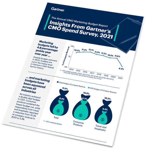 Use this marketing infographic to discover a snapshot of the top findings from The State of Marketing Budgets 2021 - Insights from Gartner's Annual CMO Spend Survey Report. Get a top view of how CMOs are prioritizing their marketing spend and channel investments to maximize ROI.