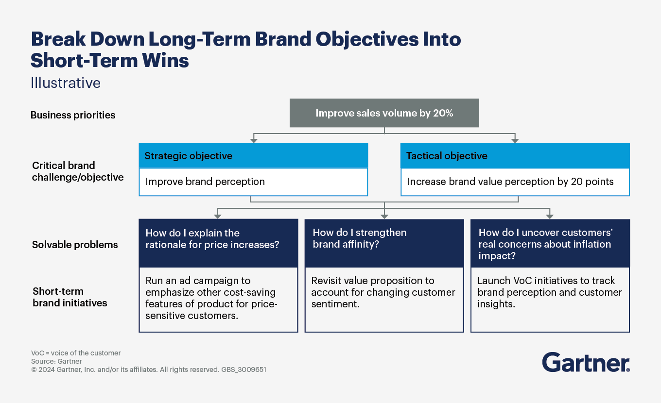 Keep conversations relevant to the short term by focusing on market disruptions and opportunities in the present that have long-term implications. For example, rising costs due to inflation can potentially have a lasting impact on customer attitudes and behaviors. To protect brand investments and meet business goals amid rising prices, break this issue down into addressable near-term actions that make sense to leaders outside of brand.