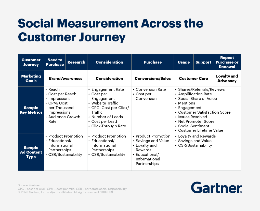 One way to easily identify and measure social advertising’s impact on business objectives is by designing and implementing a structured plan that maps your brand’s key marketing goals and measurement metrics to each phase of the customer journey.