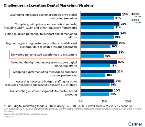 Gartner for Marketers clients can learn more in the reports Digital Marketing Survey 2021, Part 2: Old Challenges Persist as New Disruptive Forces Emerge and Digital Marketing Survey 2021, Part 3: Marketers Test Emerging Technologies to Drive Personalization.