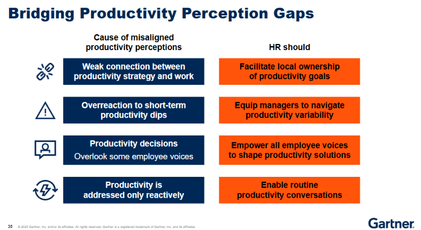 While employees report feeling 11% more productive than last year, only 10% of managers agree that their full teams are meeting productivity expectations. In this session, Swagatam Basu, Senior Director, Gartner, explored the causes of differing productivity perceptions, the impact it has on organizational outcomes, and how CHROs can leverage HR's unique position to effectively bridge this divide.