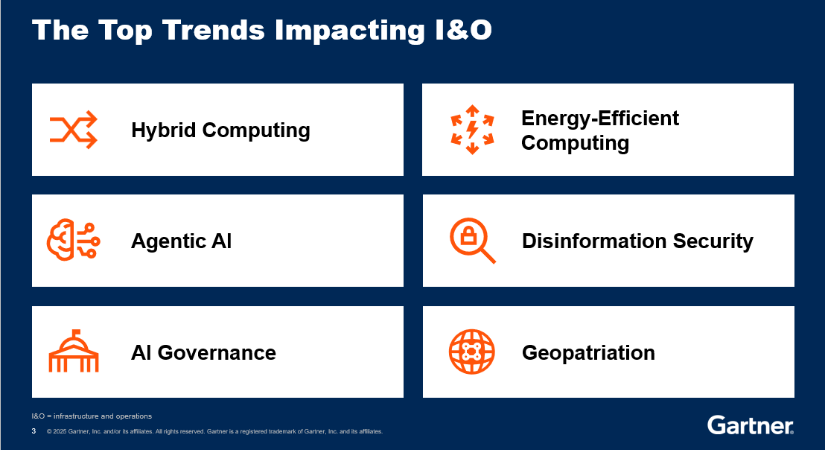 “The top trends impacting I&O over the next 12 to 18 months are: hybrid computing, energy-efficient computing, agentic AI, disinformation security, AI governance, and geopatriation.”