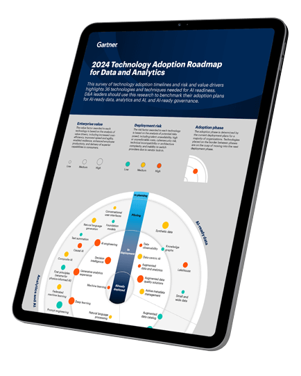 The Gartner Technology Adoption Roadmap curates the collective wisdom of 158 D&A leaders to understand deployment plans, adoption timelines, value and risks associated with 36 technologies and techniques needed for AI readiness.