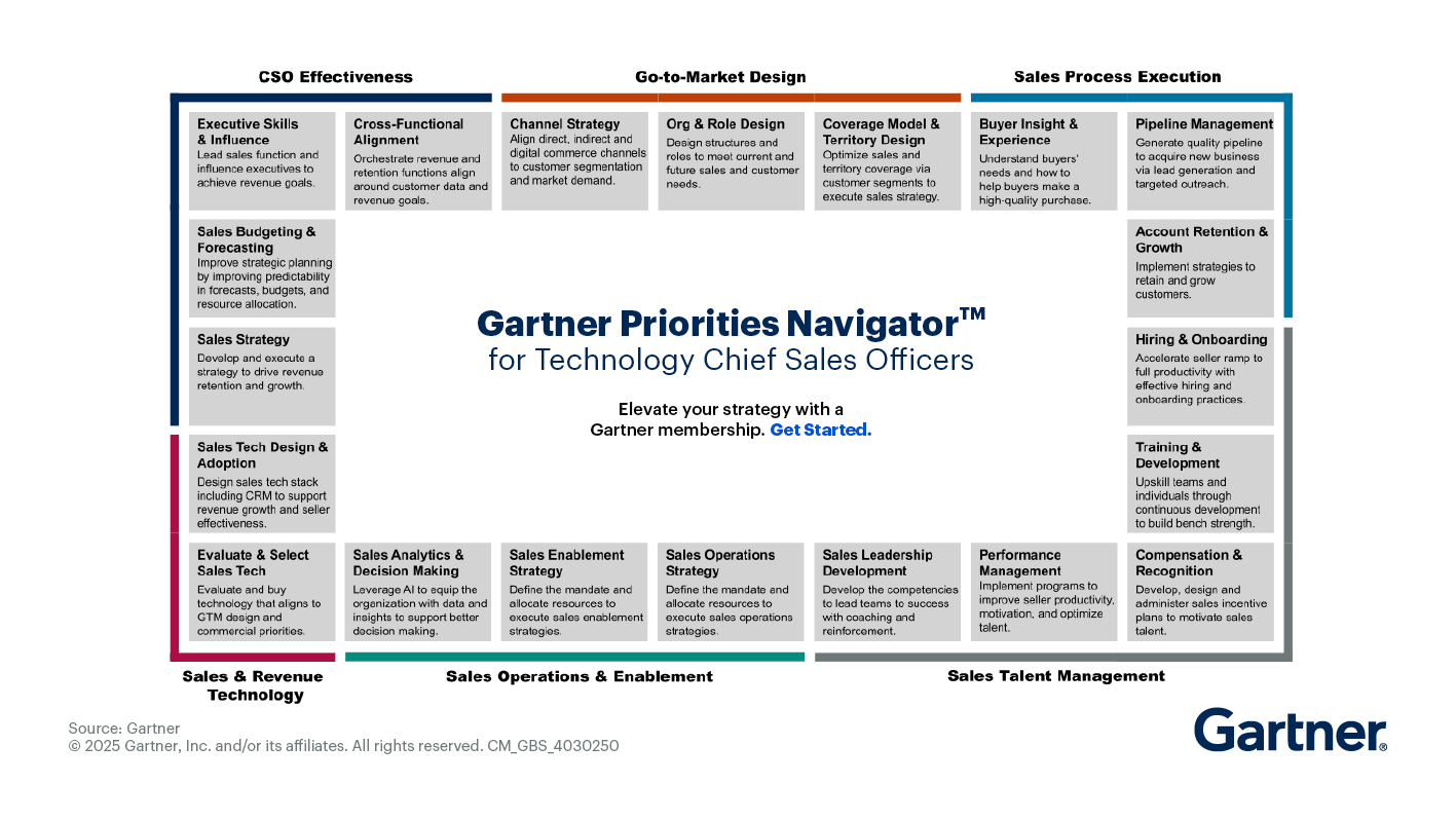 The Gartner Priorities Navigator™ framework represents mission-critical areas where Gartner provides supportive expert advice and tools to technology chief sales officers (CSOs) and their teams.