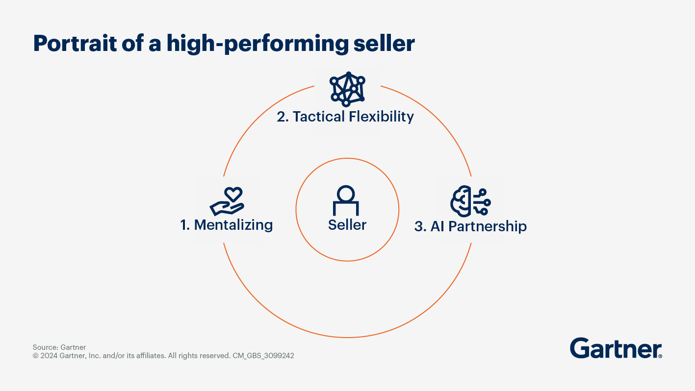 Narrow the scope of the seller role to focus on the unique human behaviors that drive high-quality deals: addressing the emotional component of purchase decisions through a set of sales skills called mentalizing and collaborating with AI teammates.