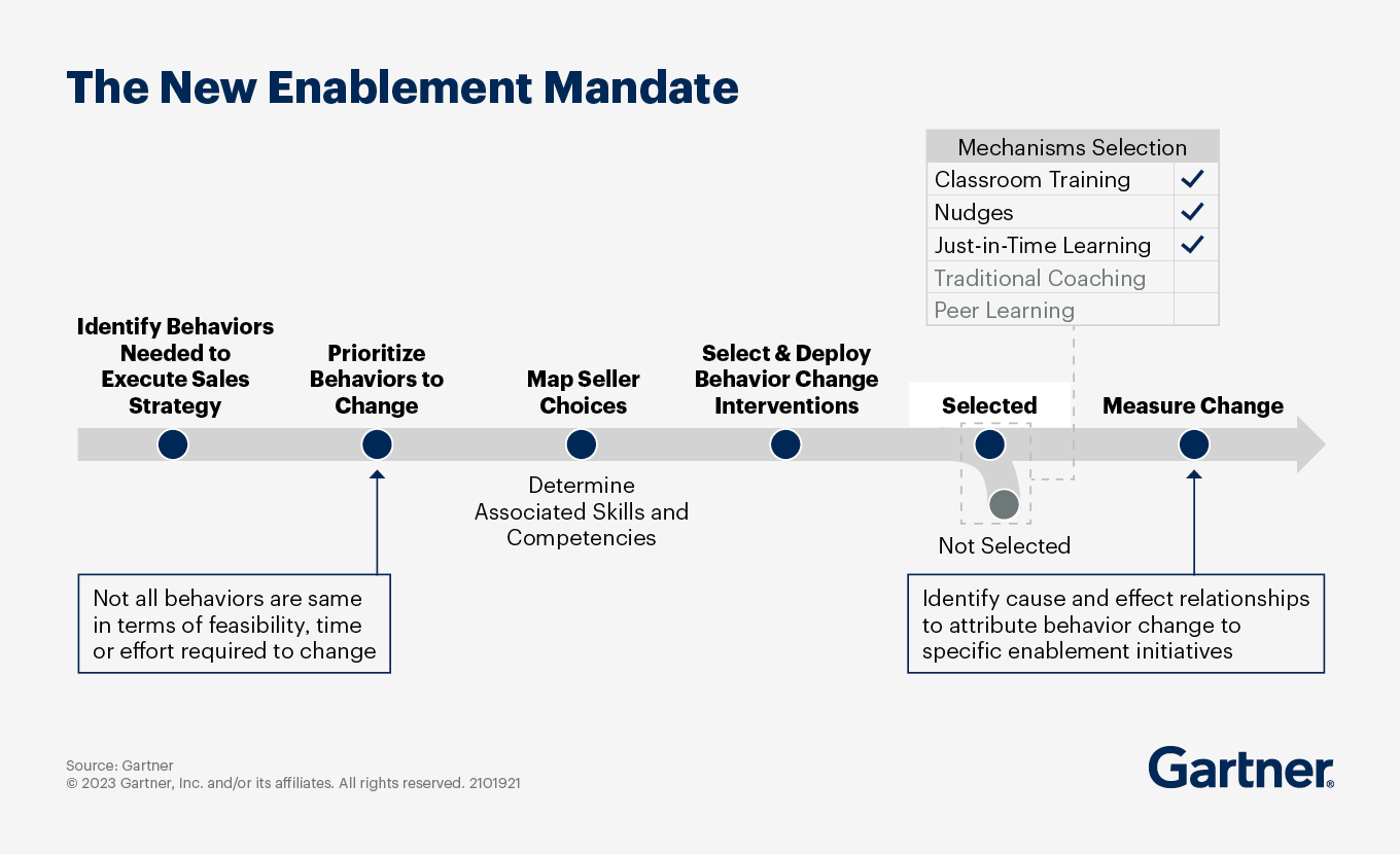 Overemphasis on formal training and communication. For many sales organizations, “enablement” equates to training — e.g., live or virtual classroom sessions, e-learning and peer-to-peer learning — which can help develop seller skills and competencies, but doesn’t always support the behaviors that help achieve sales goals.